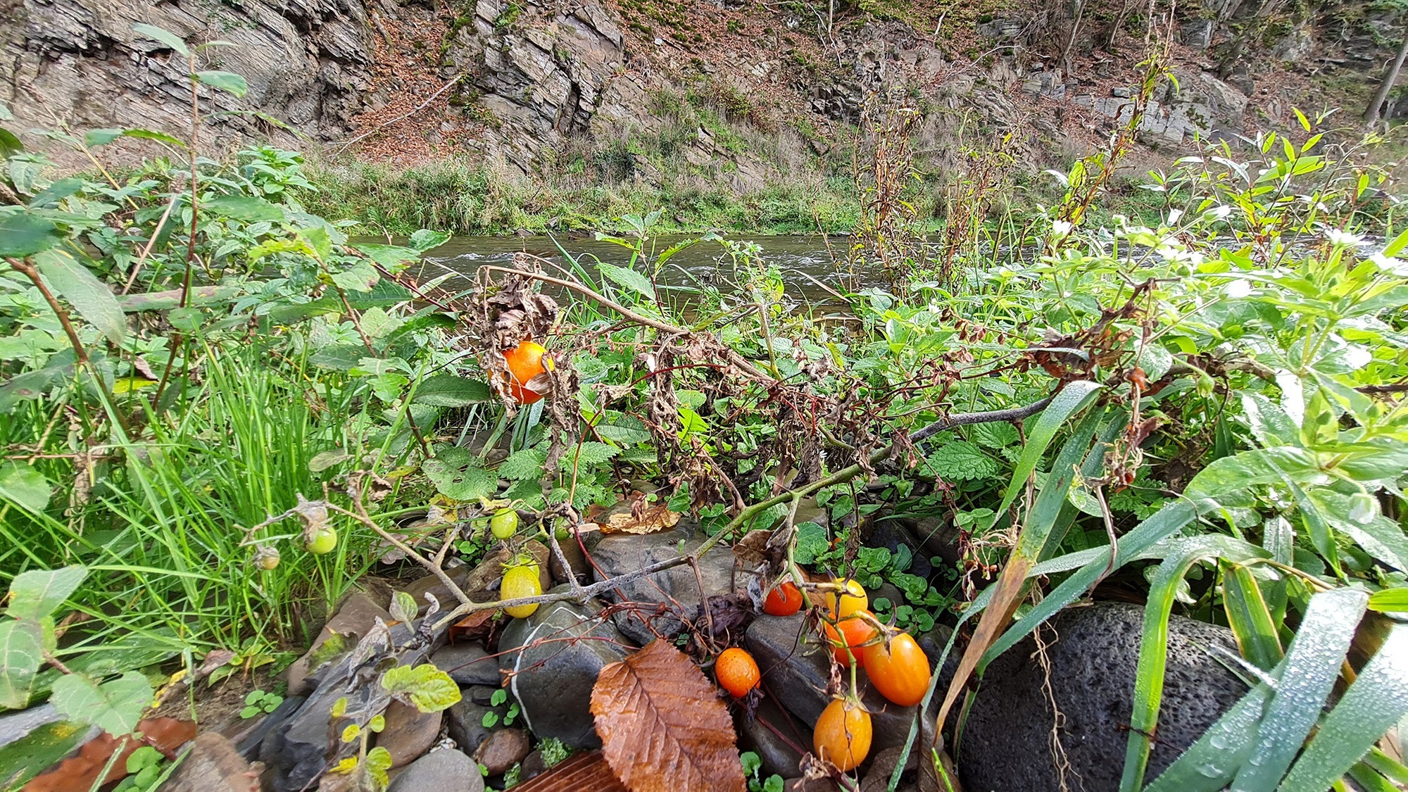 Das Ufer ist sichtbar aufgewühlt, zwischen allerlei Kraut wachsen Cocktailtomaten – wie die wohl hierher geschwemmt wurden – und direkt überm Boden riecht es stellenweise noch nach Modder.