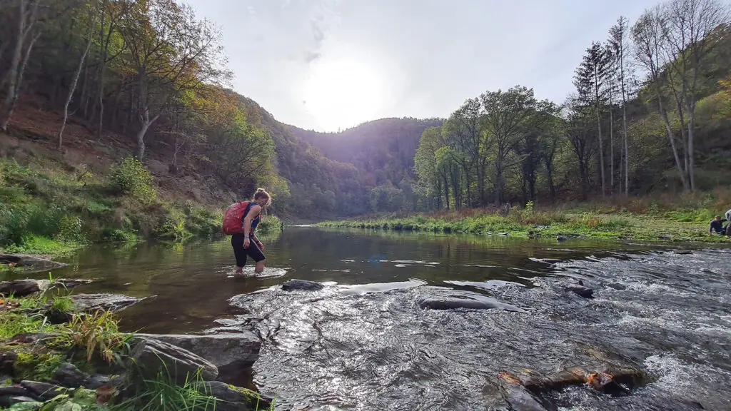 Das Wasser hier im Langfigtal bei Altenahr ist flach und klar. Die Entscheidung, durch das Wasser zu waten, fiel prompt als wir sahen, dass andere auch diesen Weg nutzten.