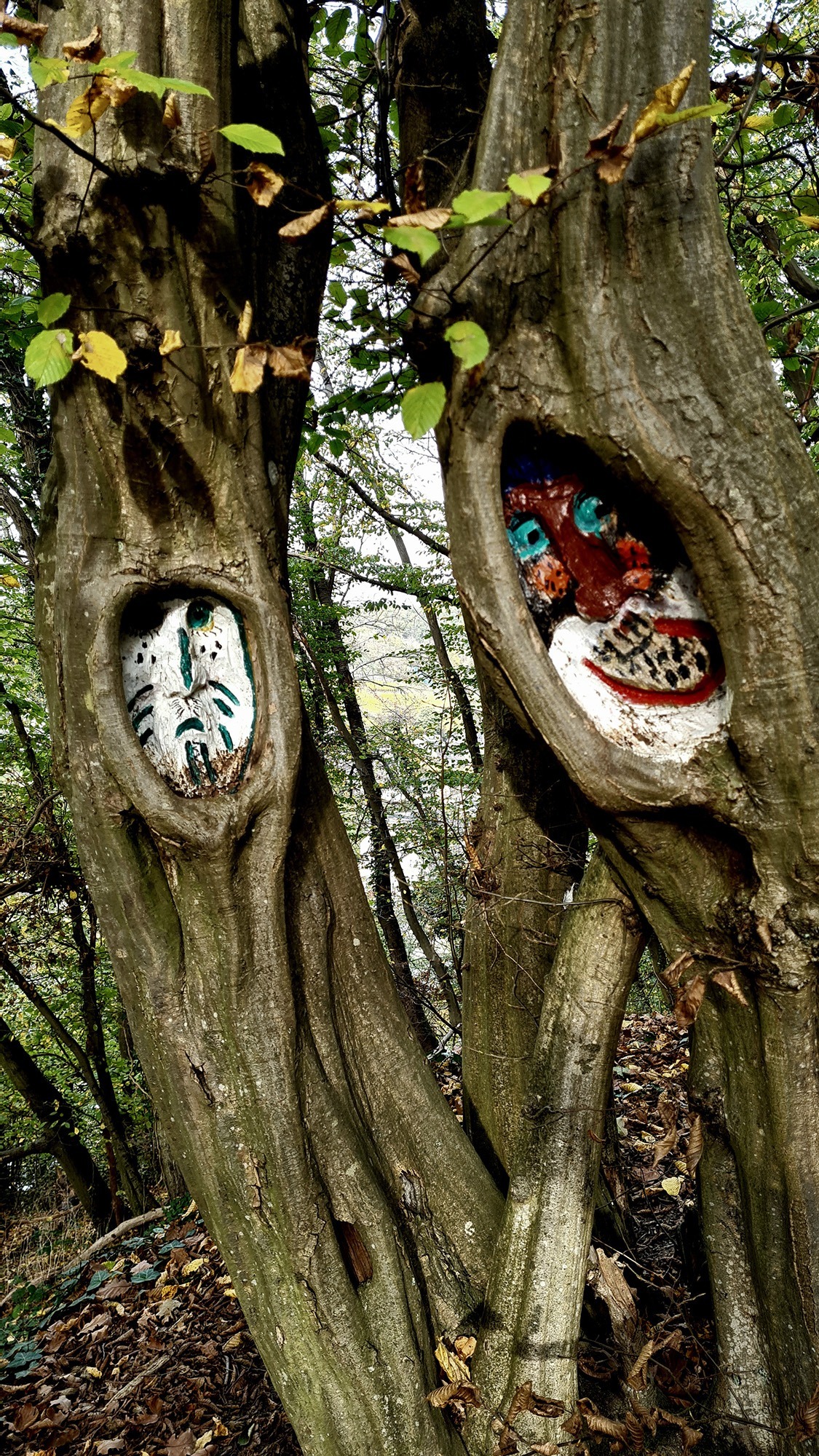 Unser Abstieg wird von bunten Baumgeistern bewacht: farbenfrohe Grimassen, die aus den Hohlräumen der Bäume zu uns hinab starren.