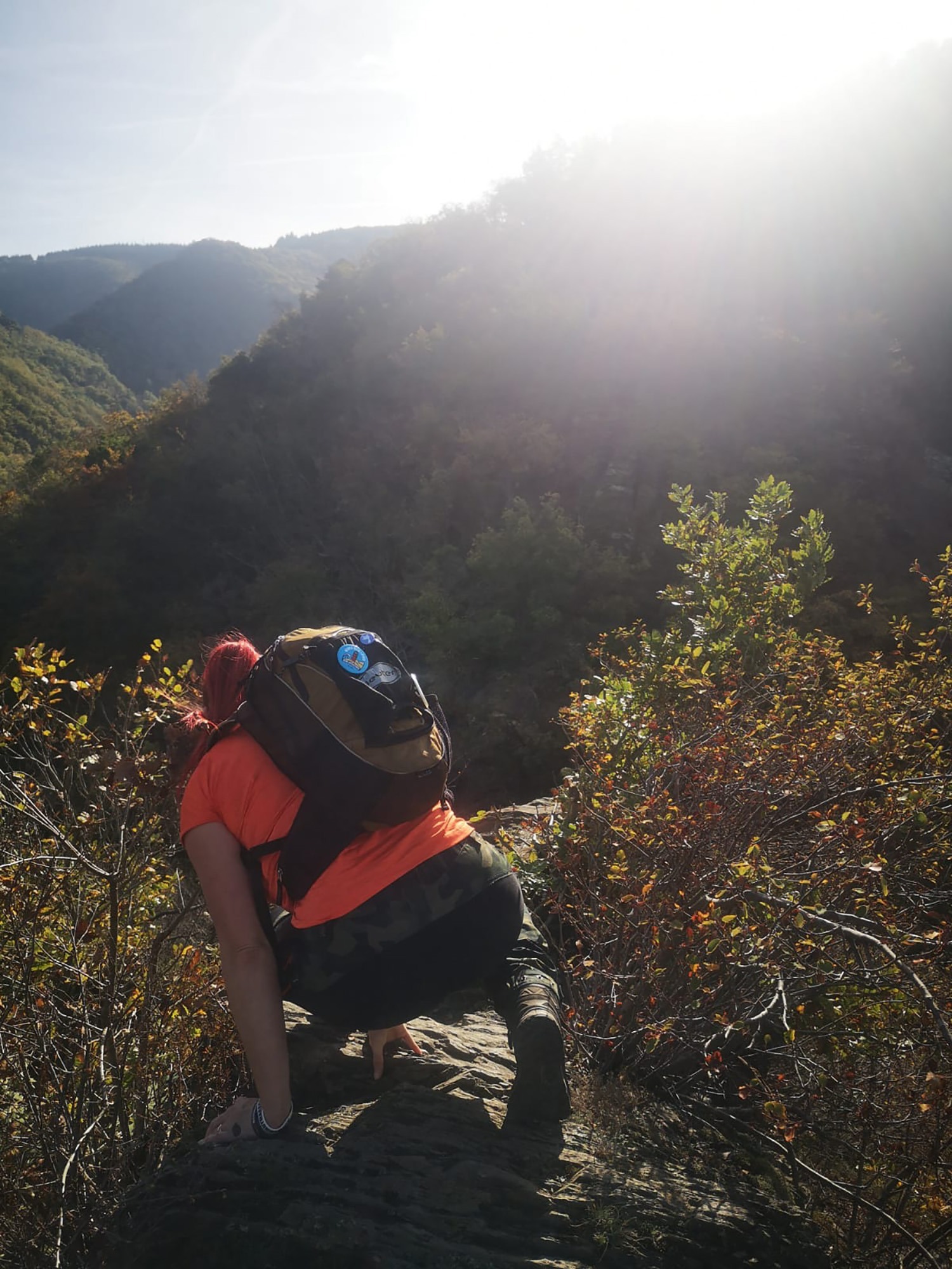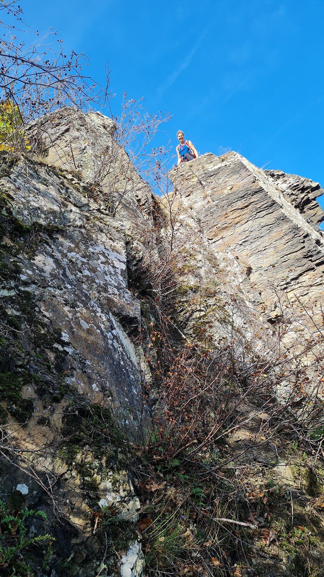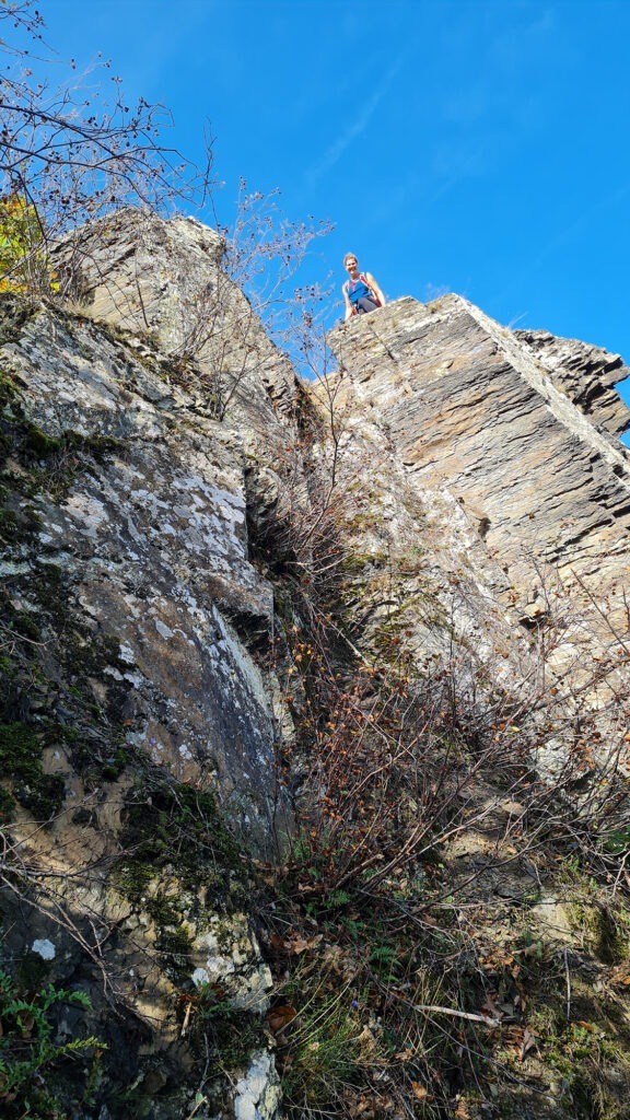 Über Stock und Stein geht’s von der Burg Are langsam aber kontinuierlich über spitze Steine, schroffe Felsen und rutschiges Schiefergeröll. Bis hinauf zum Gipfelkreuz der Engelsley mit 290 Metern Höhe.