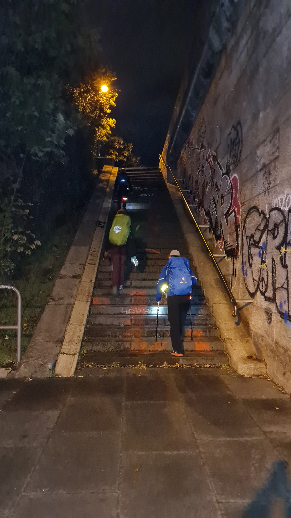 Wir zogen gemeinsam weiter in die Nacht. Beim Heraustreten aus dem zappendusteren Dünnwald wurde es wieder urban, heller und lauter.