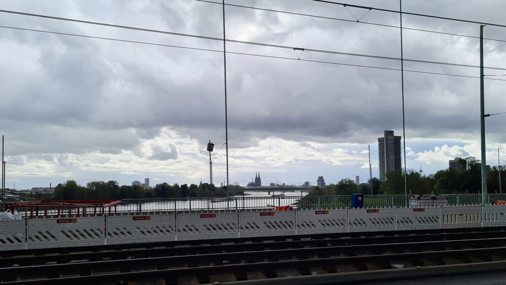 Ich konnte unserem Gast von der Ostsee noch kurz die Silhouette des Kölner Doms zeigen – da schlug das Unwetter uns mit voller Wucht entgegen. Mitten auf der Mülheimer Brücke – nach nur 10 Kilometer Strecke – peitschte der Regen auf uns herab.